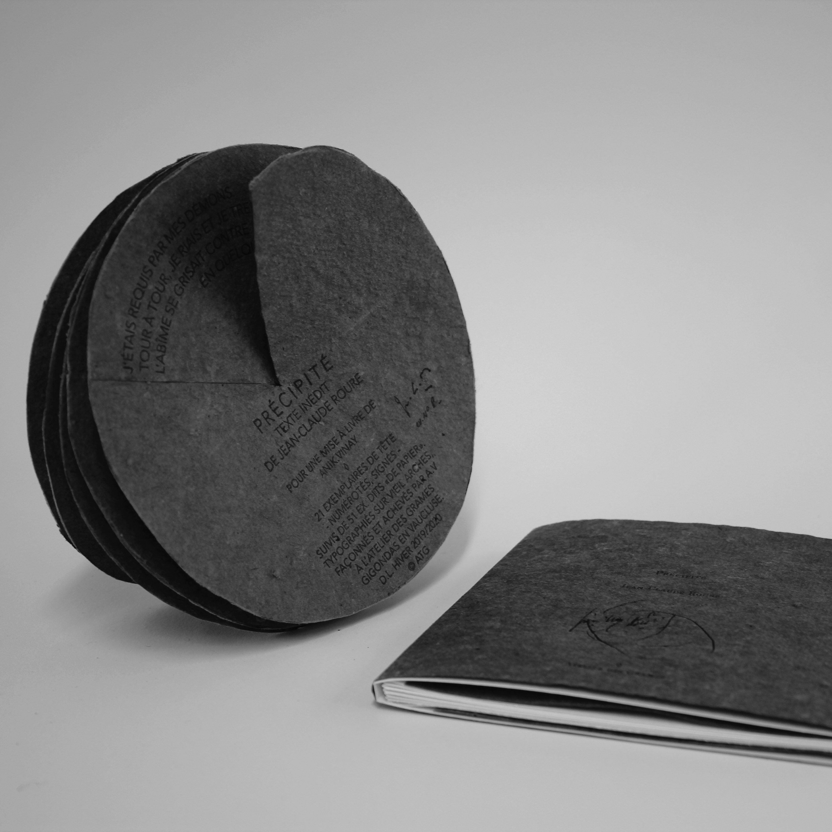 21 exemplaires dits «de tête», soit le texte typographié sur papier d’Arches teinté, composition hélicoïdale recto/verso qui constituent l’édition originale. Numérotés, signés.