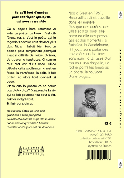 On a, depuis Icare, rarement vu voler un poète. Un bœuf, c’est différent, car, si c’est le poète qui le regarde s’envoler, tout devient plus clair. Mais il fallait bien tout un poème pour comprendre pourquoi il est si difficile de naître, d’aimer, de trouver la tendresse. Ô comme tout ceci est dur ! Anne Jullien déballe cette souffrance, la met en forme, la transforme, la polit, la fait briller, et alors tout devient si beau.