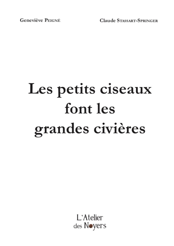 Geneviève PEIGNÉ a confié À voix nue en 2017 à L'Atelier des Noyers avec des gravures de Petra Bertram-Farille, et nous revient avec Les petits ciseaux font les grandes civières, accompagnés par les lino-gravures de Claude Stassart-Springer.