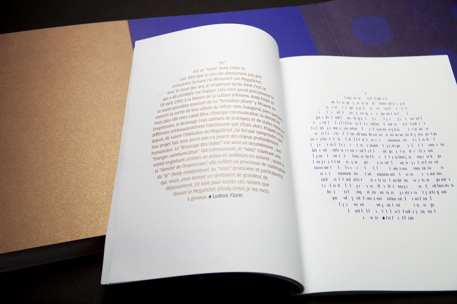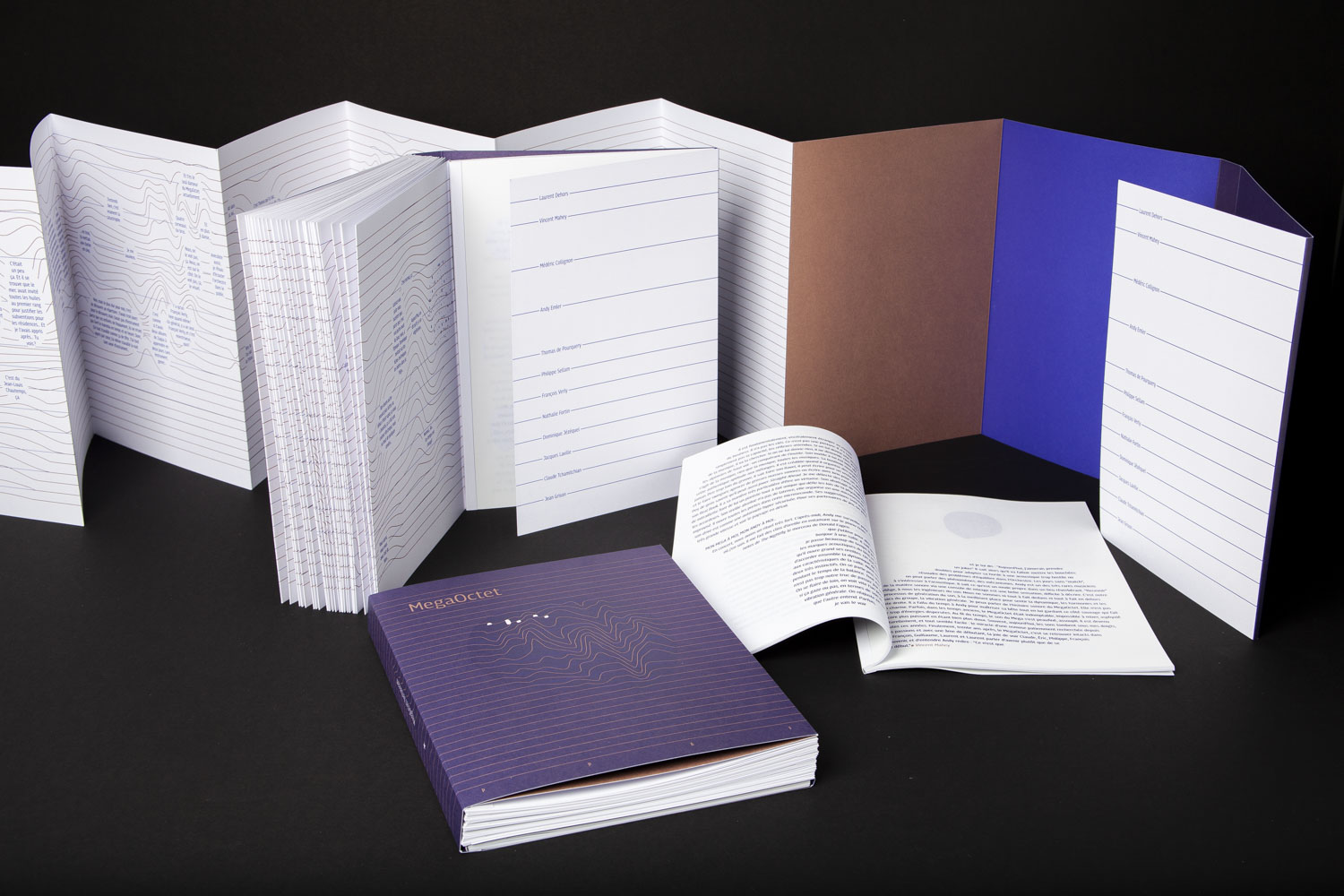 La pièce centrale du livre est un long leporello présentant des extraits d’un entretien à 15 voix. Entre partition et retranscription de pistes sonores, les mots et les signes restituent librement les échanges chargés d’émotion, de souvenirs des petits et des grands événements qui ont fait l’histoire du MégaOctet.