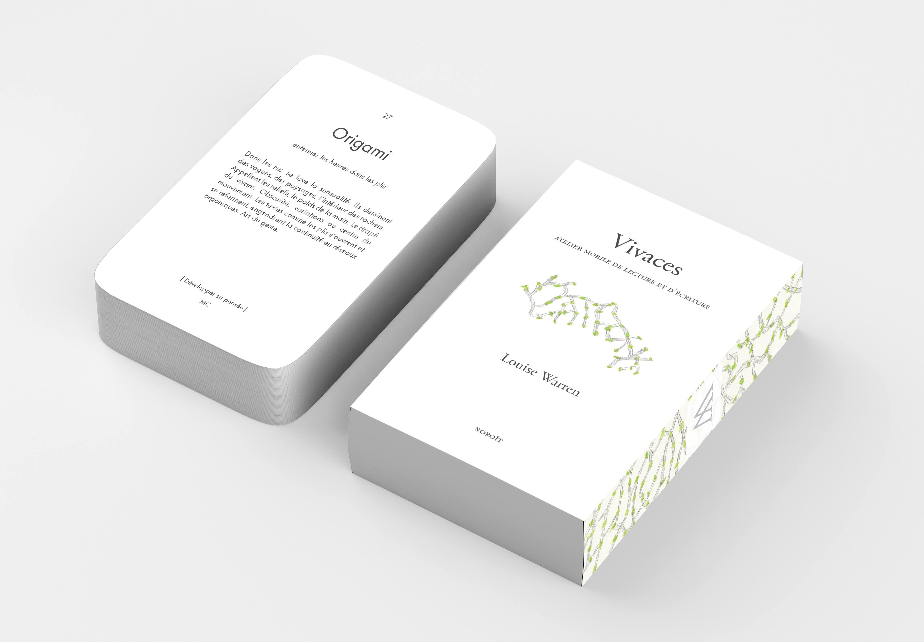Que vous cherchiez à nourrir votre élan créateur, à trouver votre voix par l’écriture ou à développer un art de vivre, le boîtier Vivaces offre un accompagnement qui soutient l’interrogation du présent à partir de l’oeuvre de la poète et essayiste Louise Warren. Grâce aux possibilités multiples de ces 99 cartes poétiques et de leurs associations, laissez libre cours à votre intuition et à vos interprétations.