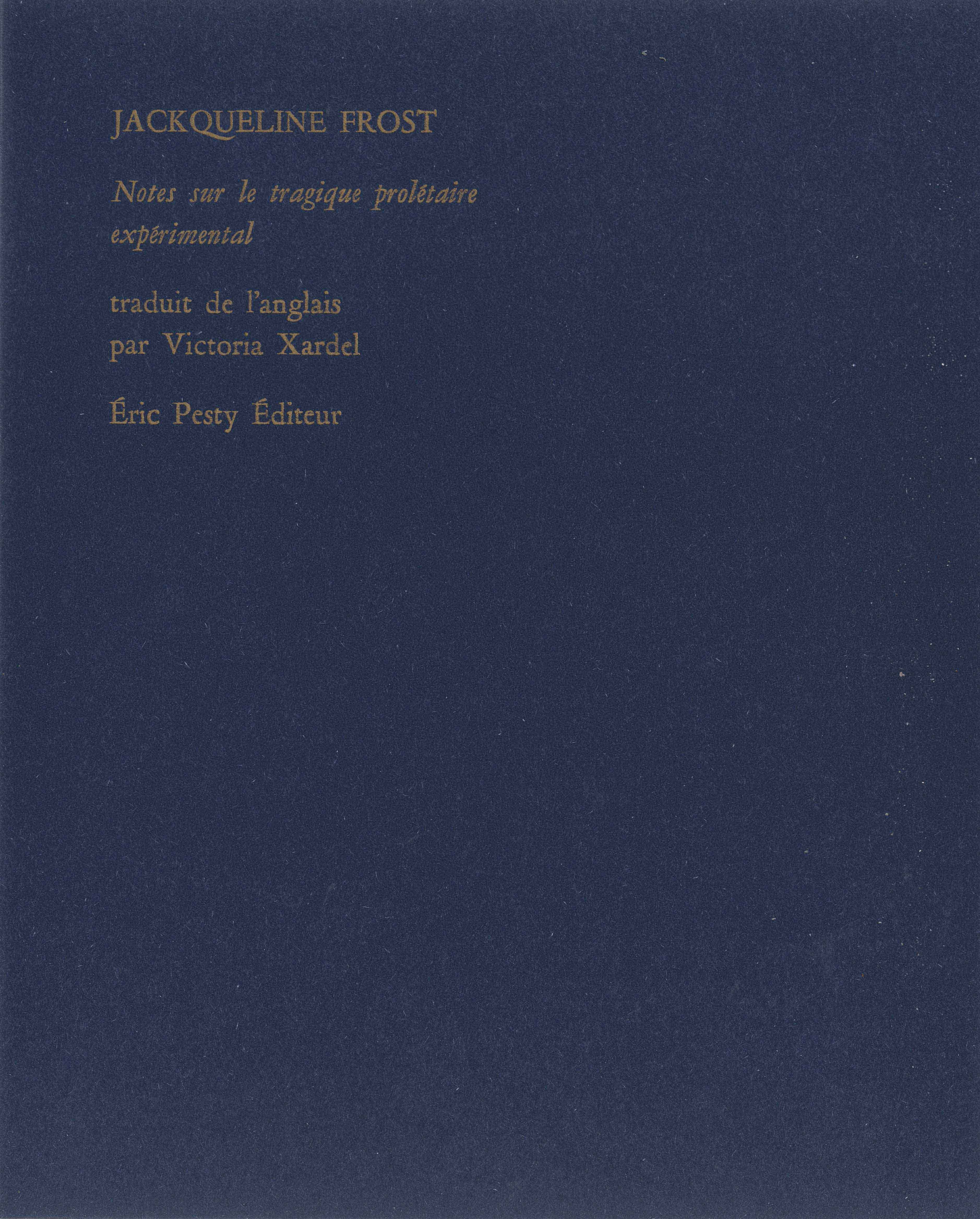 Jackqueline Frost est née en 1987 en Louisiane et réside en France depuis une dizaine d’années. Elle est poète, historienne de la littérature et de la philosophie. Elle est l’autrice de Le troisième événement, première et deuxième parties traduit par Luc Bénazet et publié dans la collection agrafée en novembre 2020, ainsi que de Notes sur le tragique prolétaire expérimental traduit par Victoira Xardel en 2024.